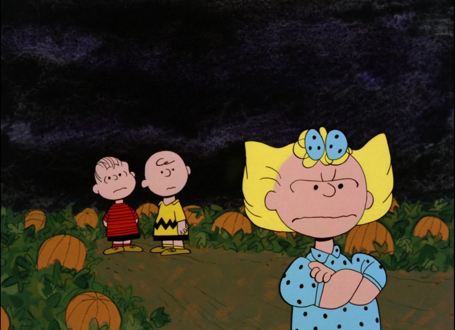 Sally leaves the pumpkin patch as Linus and Charlie Brown look on.